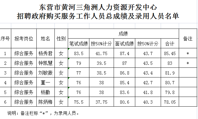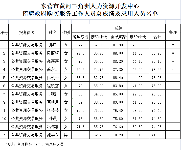 根據(jù)本次招聘活動的安排,現(xiàn)將進入面試人員的總成績及錄用人員名單予以公布。望被錄用人員按照統(tǒng)一規(guī)定和要求辦理相關錄用手續(xù)。